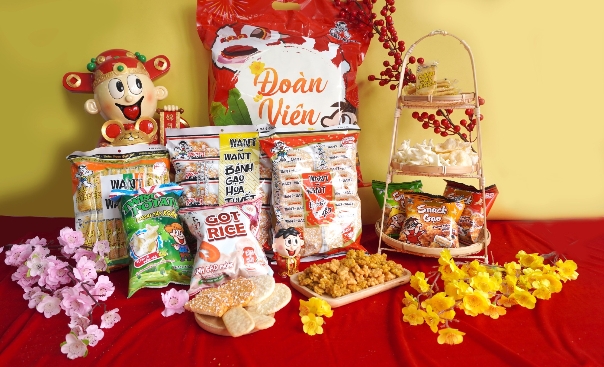Lấy cảm hứng từ hạnh phúc đoàn viên trong ngày Tết truyền thống, túi quà Tết Want Want Đoàn Viên kết hợp 8 loại bánh gạo Want Want và snack nhiều hương vị cùng thiết kế túi hiện đại, mang sắc đỏ tượng trưng cho niềm vui trọn vẹn khi gia đình quây quần bên nhau.